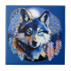 Beautiful Wolf with deep yellow eyes, with Native American Dreamcatcters, in a Wild Blue Mountains Landscape and Full Moon. Original Vector Round Logo Design isolated on white Copyright BluedarkArt TheChameleonArt.