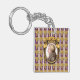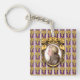 The original artwork by ZoeSPEAK on this Keychain features a portrait of the classical music composer Wolfgang Amadeus Mozart. The portrait is a profile set in an ornate oval golden frame. The frame hangs on a purple wallpaper background with golden bunches of grapes in rows, and vertical white and lavender stripes.