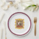 From an original series of designs for classical music collectors plates, this Paper Plate features a portrait of the composer Wolfgang Amadeus Mozart. The portrait is a hand tinted etching, surrounded by an original illustration of an oval golden frame with gold ribbons at the top. The frame is on a background of purple wallpaper with rows of bunches of golden grapes and vertical white stripes. Under the portrait, in red, is the composer's name. The wallpaper is surrounded by more gold ribbons, in the centre of the plate against a white background. There is a purple band with golden bunches of grapes and a red border around the edge of the plate.