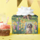 A cheerful dog sits peacefully on lush green grass, surrounded by colourful spring blooms under a soft blue sky. This digital oil painting captures a serene moment with expressive brushstrokes, warm colours, and a sense of gentle joy.
