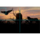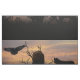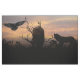 Two wolves and a flying raven on a silhouetted landscape and a clouds sunset.