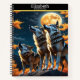 In a captivating artwork, three majestic wolves harmoniously howl at a luminous full moon. Surrounding them are vibrant autumn trees, creating an enchanting atmosphere that captures the spirit of the wild and the beauty of nature under the night sky.