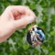 a keychain with a picture of a wolf pup howling with an adult wolf in the background also howling. also in the background is a picture of the earth and moon.