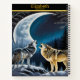 Two majestic wolves howl in unison beneath a shimmering crescent moon. The tranquil night sky is dotted with stars, while a serene forest frames the scene, capturing the essence of nature's wild beauty during a chilly winter night.