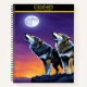 Two majestic wolves stand atop a rocky outcrop, their heads tilted back as they howl at the luminous full moon. The sky is painted with deep purples and oranges, creating a captivating twilight backdrop that enhances the wild beauty of the moment.