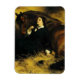 Magnet featuring Sir Edwin Henry Landseer’s oil painting The Shrew Tamed, or The Pretty Horsebreaker (1861). An elegant woman in black clothing lounges next to a beautiful brown horse. A small dog watches in the background. They all sit in a barn of hay. A perfect gift for horse lovers and Victorian art.