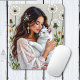 A pretty mouse pad with an illustration of a woman holding a white fluffy cat surrounded by dandelions, The picture has a crochet style fabric look.