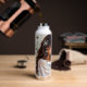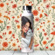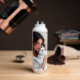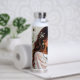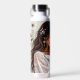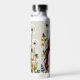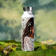 A pretty water bottle with an illustration of a woman holding a white fluffy cat surrounded by dandelions, The picture has a crochet style fabric look.