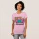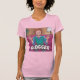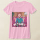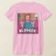 This is a Blogger Career T-Shirt. The blogger design was created with generative art. The artwork features a comic illustration of a woman sitting on a sofa and smiling happily. The woman is wearing a blue shirt and a green vest. The background is a living room with a plant and a lamp. The text Blogger is below the woman. The t-shirt is a pink Bella Canvas T-Shirt. The image is on the front and back of the t-shirt. You can change the image with the Personalise button.