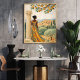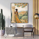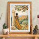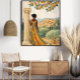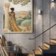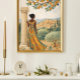 Capture the timeless beauty of the Mediterranean with this elegant illustrated scene of a woman standing beside a classical column, overlooking a sunlit hillside village. Dressed in a flowing patterned dress of warm gold and teal tones, she gazes across olive groves, cypress trees, and terracotta-roofed homes nestled among rolling hills.