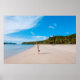 Woman doing acrobatic on seashore near mountain ra poster