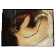 This design features a painting by the American Impressionist artist Joseph DeCamp (1858–1923). It depicts the bare back of a beautiful woman as she reclines graceful on her bed. Her legs are wrapped around the white blanket that sits on top of her bed, but her bare feet are visible. All of the creamy skin on her back is exposed. She is drying her hair after having had a bath. The woman is holding her long brown hair in her hand as she tries to dry it. Her hair is lustrous. The woman's posture is sultry and sensual. The original artwork was painted by Joseph DeCamp in 1899.