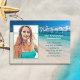 Adult woman graduation announcement with party invitation text. Tropical beach scene cards with vertical photo template on the left side and three text templates on the right. Name at top in white script. School and grad year, etc. also in white. Party invitation text is in printed sea blue colour. Reverse is solid tropical blue colour. Upgrade the paper, or choose the instant download option.