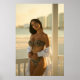 A woman stands in an outdoor setting by the beach wearing a leopard print bikini and an open white shirt. The background features distant buildings under a warm sunset glow.