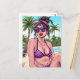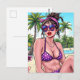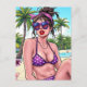 A postard you can frame or mail to a friend with a pretty pop art lady in a purple polka dot bikini, sunglasses and bandanna on the beach in a tropical comic book style. Say hi to a friend or just keep it for yourself for the cute artwork!