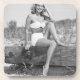 Woman wearing bikini sitting on log on beach, (B&W), (Portrait) | George Marks | AssetID: 57416977