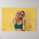 Woman in blue bralette holding sunglasses putting poster