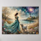 Woman in blue gown, on beach surrounded by flowers is stared at adoringly by her golden retriever as she looks across the bay at a lighthouse, colorful skies in the distance.