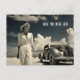 Low angle photograph-style digital artwork of a beautiful blonde-haired woman in a white pantsuit along Miami Beach's white-sands beach near a parked car in a 1940's retro style.