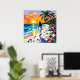 Beach home poster. A beautiful ai illustration done in an oil painting impasto style. A woman walking on the beach among palm trees, tropical flowers, turquoise waves, sea glass and seashells.