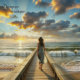This woman on pier at sunset decoupage paper captures a barefoot figure walking towards the glowing horizon, waves breaking at her sides. The warm tones of dusk and the vastness of the sea make this piece ideal for projects with themes of reflection, journey, and serenity.