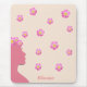 Pink woman silhouette, pink flowers and calligraphy on beige background.