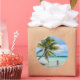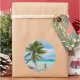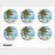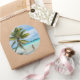 Round photo sticker of a woman in bikinis under a hanging palm tree in the shallow water of the lagoon at the beach of a tropical island in the pacific archipelago French Polynesia.