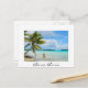 Postcard of a woman in bikinis under a hanging palm tree in the shallow water of the lagoon at the beach of a tropical island in the pacific archipelago French Polynesia with a white border and the text: 'Bora Bora'.
