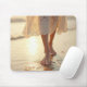 A woman walks barefoot on wet sand with gentle waves lapping at her feet
