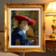 A woman wearing a vibrant red hat blowing a bubble gum, adding a playful touch to the scene. The background features ornate and detailed décor, contrasting with the whimsical element in the foreground.