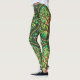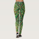 Woman wearing vibrant leggings with an intricate green leafy pattern and red berries, resembling stained glass. Sneakers peek in at the bottom.