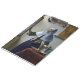 Woman with a Water Jug by Johannes Vermeer, oil on canvas c. 1662, is an interior domestic genre painting of a lady in blue dress and white bonnet holding a pitcher of water while opening a stained glass window. Less formally geometric than many of Vermeer’s compositions, Woman with a Water Jug emphasizes the effects of natural light, reflections and translucency on figure, objects, colour and texture. The metallic water jug and dish at centre partake and reflect the colours of the room and objects around them in a masterpiece of naturalistic realism. Vermeer was known for his unsparing use of expensive artist pigments such as vermillion red (cinnabar) and natural ultramarine, lapis lazuli, as here on the woman’s dress, bonnet, jug and ornate tablecloth.
