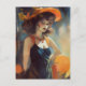 A beautiful woman wears a black dress with orange straps and an orange hat in an autumn theme painting