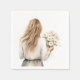 Watercolor art of a young woman with a daisy bouquet on white background.