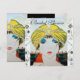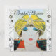Vibrant ,classy stylised French Art Deco high fashion illustration with geometric swirls,circles. Portrait of a beautiful young elegant lady wearing a yellow oriental hat with feathers in black white ,yellow ,blue red colours ..Cool ,modern and artistic party invitation.