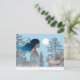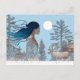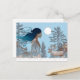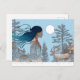 Woman with reindeer in the snow by log cabin postcard