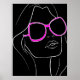 Black background with a woman's face wearing hot pink rimmed sunglasses using white line art retro design. Trendy minimalist piece of wall art.