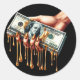 womans hand 100 dollar bill liquid gold dripping classic round sticker