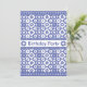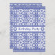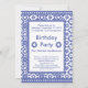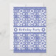 Elegant birthday party invitations - easily customisable. Blue and white traditional floral chequerboard pattern.