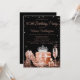 Womans rose gold birthday party invitation with pretty rose gold high heel shoes, perfume bottle, champagne glass, crown and gifts on a beautiful black glitter background. This womans rose gold birthday party invitation is easily customised for your event by simply adding your event details. You can change the background colour and the text colour.
