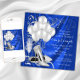 Royal blue and silver birthday party invitation featuring beautiful silver glitter high heel shoes, balloons, champagne pearls and elegant silver swirls on a luxurious royal blue satin background. This elegant blue and silver birthday party invitation is easily customised for your event by simply adding your details in the font style and colour, wording and layout of your choice. You can also move or delete the swirls, champagne and balloons. This is a printed design with no real jewels, pearls, glitter, etc.