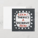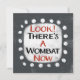 An irreverently weird typographic animal design that says "Look! There's A Wombat Now". It features black and red text on a white rectangle with funky, playful white dots surrounding it, all on a grey background.