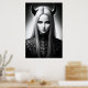 A black and white portrait of a young demon lord lady with long blonde hair and horn. This is a AI generated art.