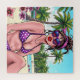 A pretty pop art lady in a purple polka dot bikini, sunglasses and bandanna on the beach in a tropical comic book style.