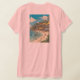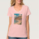 Design a women’s basic V-neck t-shirt featuring a detailed pen and ink illustration of Boracay Island, inspired by Hergé’s style from the Tintin comics. The artwork should depict the island’s vibrant tropical landscape on a sunny day, with detailed line work capturing the lush palm trees, pristine beaches, and turquoise waters. The illustration should incorporate bold, vibrant colours to reflect the island's lively atmosphere and clear skies, while maintaining the classic Tintin comic aesthetic with clean lines and subtle shading.