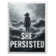 A striking black-and-white wall art print featuring the silhouette of a woman standing strong amid turbulent waves. With her hair blowing in the wind and posture upright, she faces the storm with unwavering resolve. Bold typography beneath her reads: "SHE PERSISTED", symbolising strength, endurance, and courage in the face of adversity. The dramatic seascape emphasizes the power of inner strength and resilience, making this piece a bold statement for empowerment.