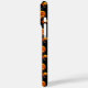 This image depicts a creatively styled pumpkin character with a large carved pumpkin head, designed to look like a jack-o'-lantern with a mischievous, sharp-toothed grin and slanted, intense eyes. The carved pumpkin head has a prominent green stem on top, adding to its bold look. The character's body is dressed in orange attire, matching the Halloween theme, and stands in a power pose with arms lifted slightly as if holding up the large pumpkin head. Two smaller pumpkins with similar expressive carvings are positioned on each side of the character, enhancing the spooky, playful aesthetic. This setup creates a fun and festive Halloween scene.