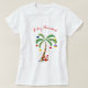 Women's shirt is shown with a festive holiday palm tree print with Feliz Navidad text.