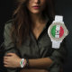 A stylish women's watch in crisp white enamel, adorned with rhinestones. The watch face features the vibrant colours of the Italian flag - green, white, and red. To make it uniquely yours, your name is boldly written in pretty black lettering. It's a chic and personalised accessory that effortlessly combines fashion and individuality.