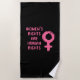 Beach towel with a feminist message, features pink female symbol and "women's rights are human rights" text in brush stroke style font on black background.